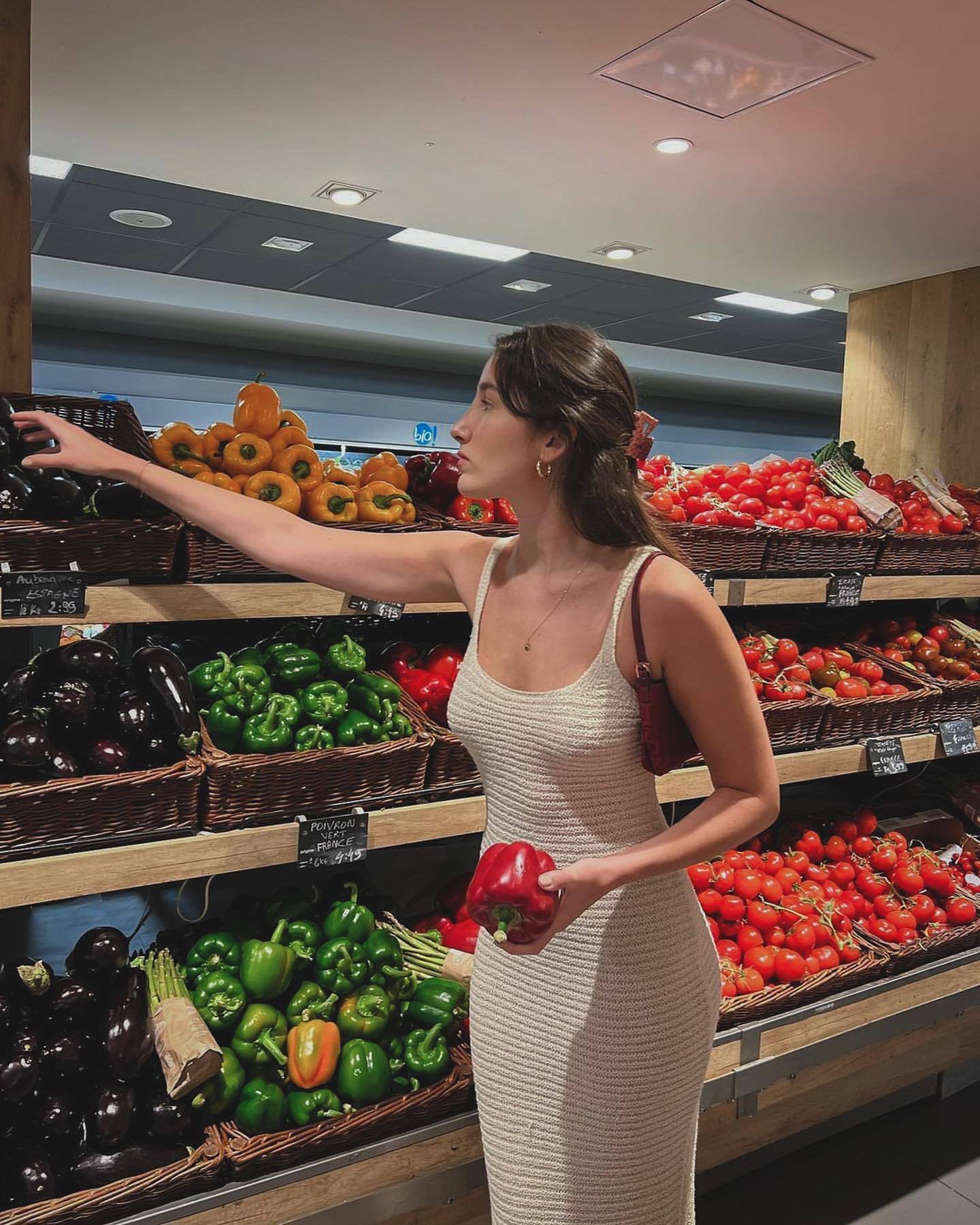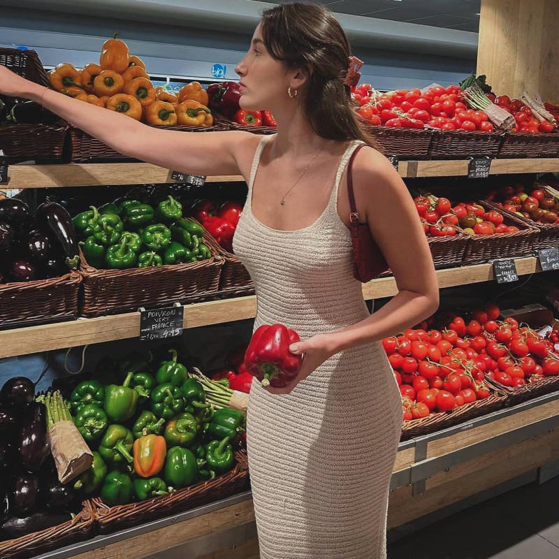 This dress features a solid beige tone with a high‑waist cut that creates a flattering, elongated silhouette.